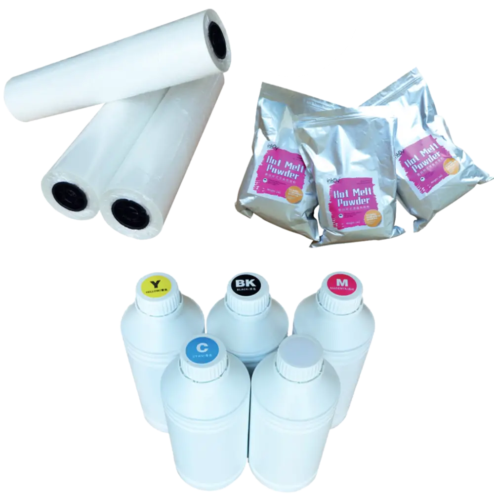 Todo o tipo de produtos consumíveis para impressoras DTF. Desde tintas dtf, filme PET dtf, cola em pó preta ou branca, entre outros.